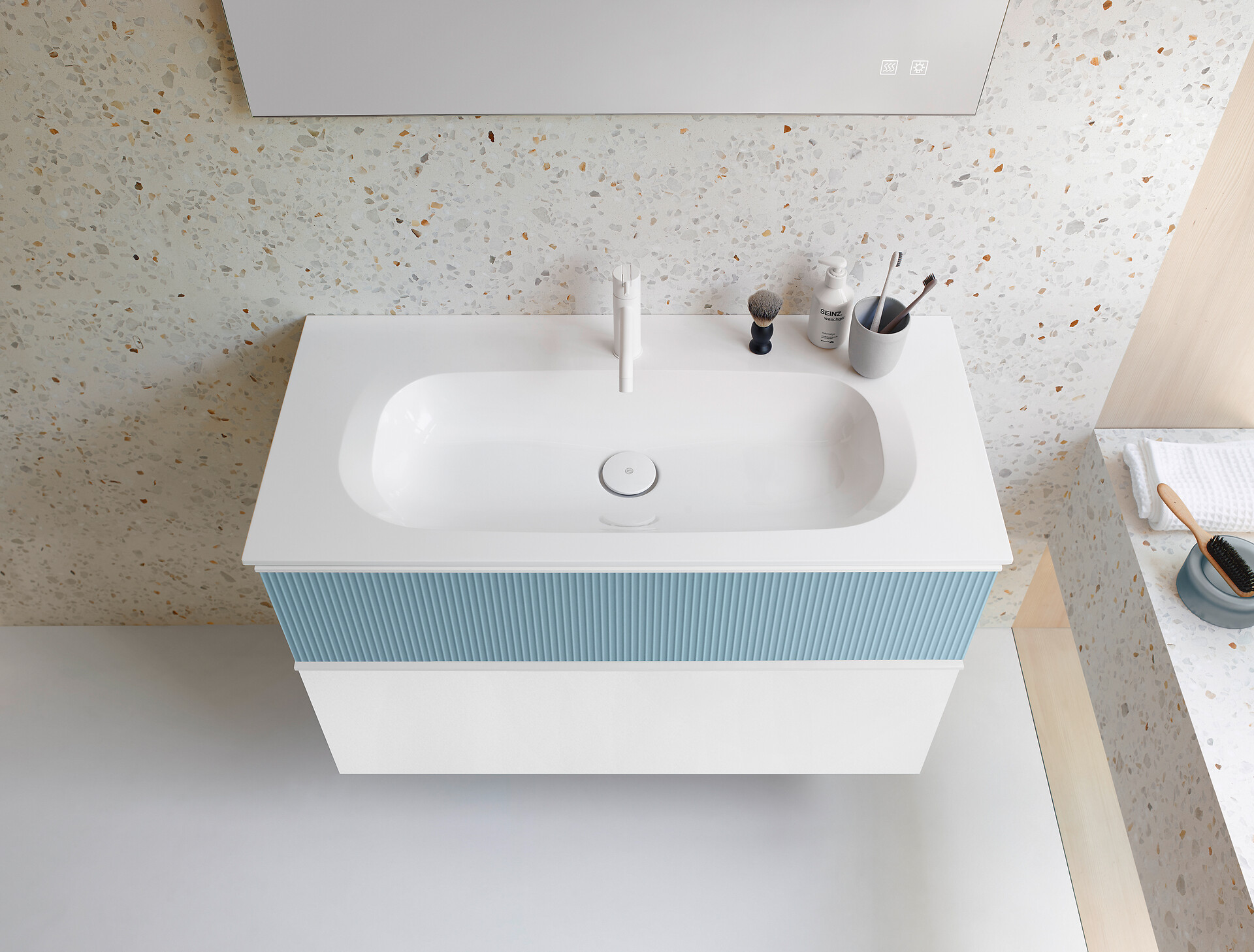 Für das Badezimmer hat Designer Patrick Frey diesen Trend zusammen mit burgbad nun praxistauglich umgesetzt: Statt der horizontalen Profilierung mit Plisseefronten bei der Originalkollektion Fiumo zeigen die neuen Fronten von Fiumo 2.0 ein vertikales Muster. Die eingefräste, thermofolierte Oberflächenstruktur wirkt dabei eher filigran als robust – ein feines Linienmuster, das dem Möbel mit seinem Schattenspiel Lebendigkeit verleiht und es weniger massiv wirken lässt. Typisch burgbad: Mit den weich ausgearbeiteten Kanneluren ist das Oberflächenrelief nicht nur besonders pflegeleicht, sondern erweist sich auch als echter Handschmeichler.